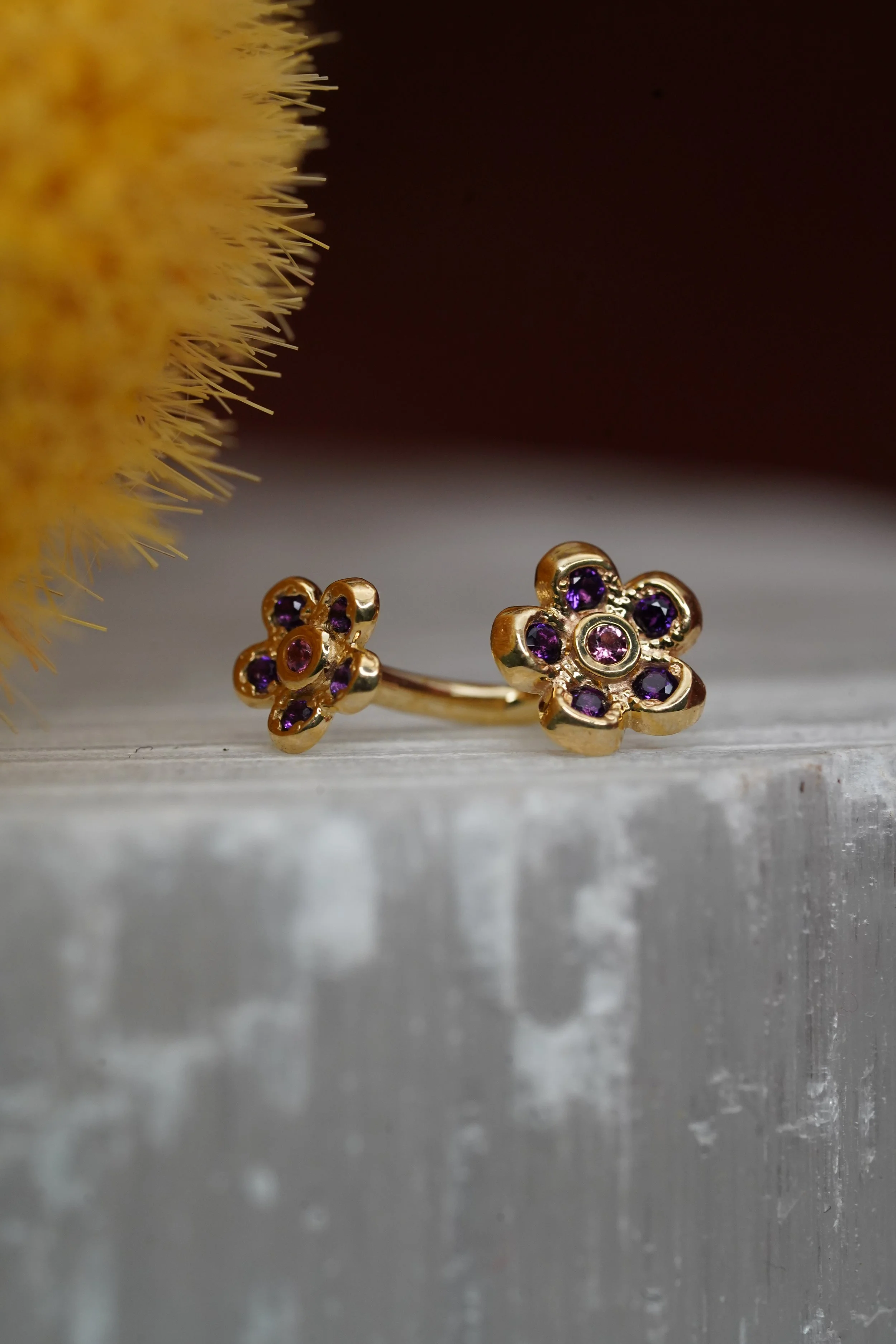 These lovely J-Curves handcrafted by Body Vision Los Angeles are the perfect flowery piece for a healed rook piercing! The J-Curve barbell has more bend than a classic curved barbell, making the bottom gems and decoration more visible in the ear! Each of these pieces are set in 14 karat gold featuring 1mm gems in the top flower, and 1.25mm gems in the bottom flower. They are all 16 gauge with 1/4” wearing surface!
